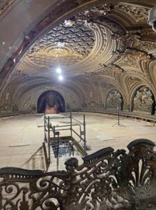 Surveying of the plasterwork in the Theatre has begun and the onsite team is working to restore the pieces that can be saved. These pieces will not only be re-installed in the Theatre but will be used to create casts for pieces that have been lost over time. Since much of this work is being completed onsite scaffolding has been erected throughout the lobby to assist in the work. Once plasterwork is completed, the surfaces will be gently cleaned and painted as needed.